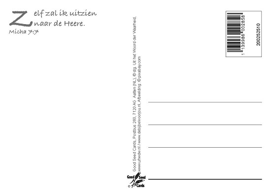 Enkelvoudige ansichtkaart. Tekst op de achterzijde: "Zelf zal ik uitzien naar de Heere. Micha 7:7" Stevige kaart voor een vriendelijke prijs: het voordeel van onze webwinkel